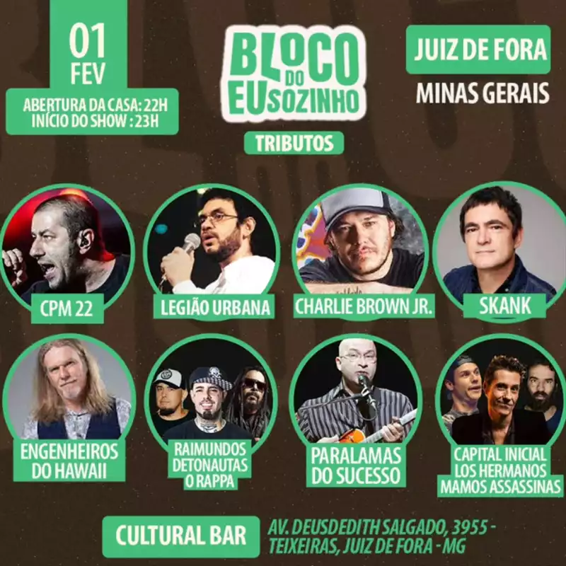 No dia 01/02 (sábado), as 22h, o Cultural Bar recebe o evento Bloco do Eu Sozinho em Juiz de Fora.