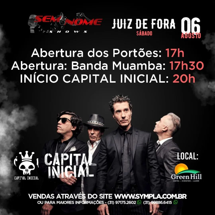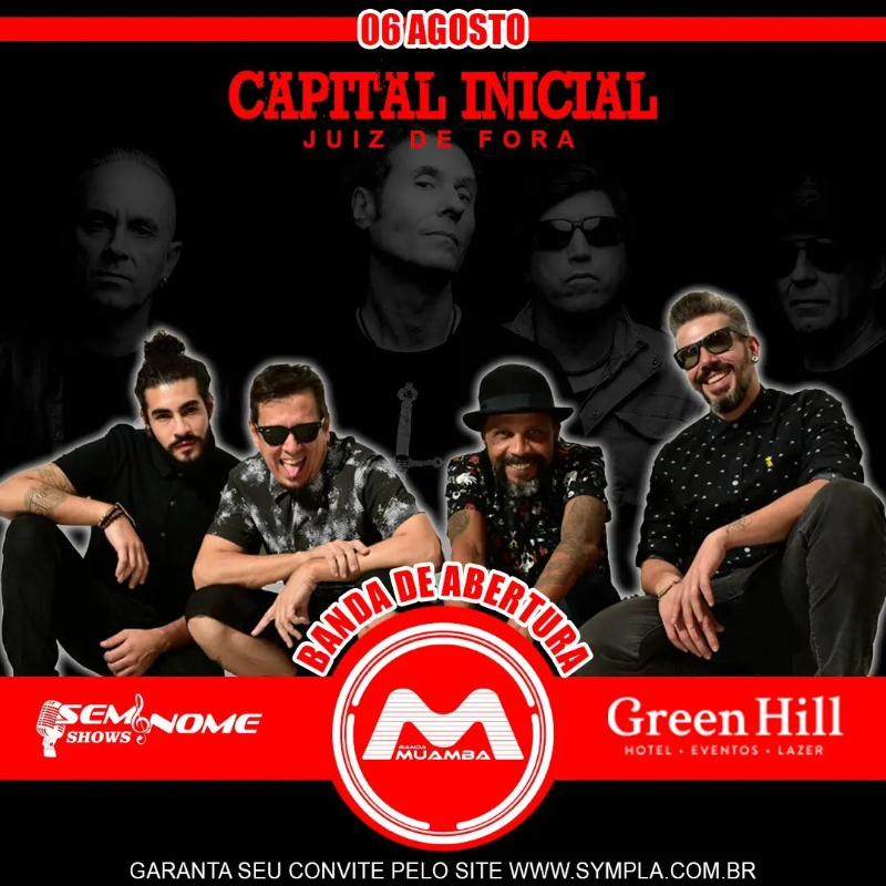 #VocêSabePrimeiroNoZine: No dia 06/08 (sábado), a partir das 17h, o Hotel Green Hill recebe o show da banda Capital Inicial, em Juiz de Fora. O show de abertura será da banda Muamba.