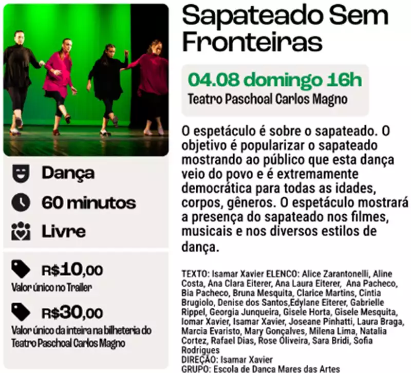 No dia 04/08 (domingo), o Teatro Paschoal Carlos Magno recebe o espetáculo de dança "Sapateado sem Fronteiras".
