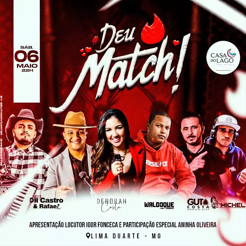 No dia 06/05 (sábado), a partir das 22h, ocorre o evento Deu Match em Lima Duarte, na Casa do Lago Eventos.