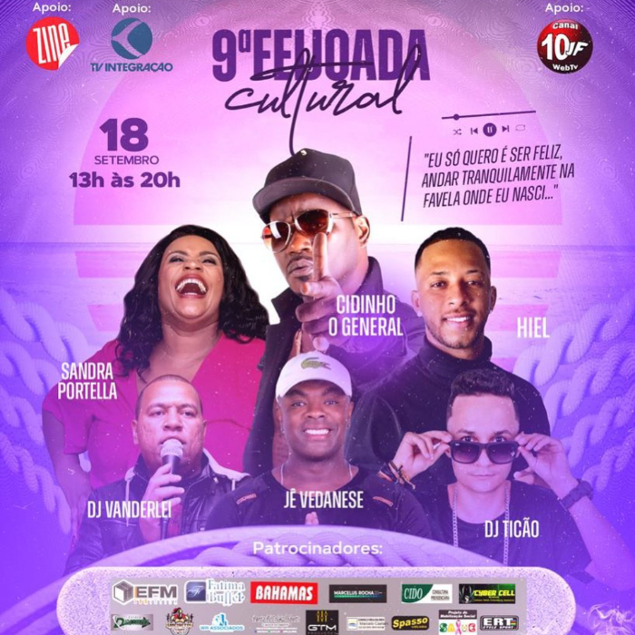 Na programação estão inclusos shows do MC Cidinho – O General, o cantor de pagode Hiel, Sandra Portella, Jê Vedanese e DJ Ticão. Confira como adquirir seu abadá (direto ao evento com feijoada):