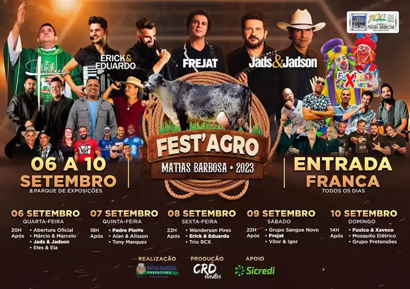 Do dia 06 a 10/09 (quarta-feira a domingo) ocorre a Fest' Agro Matias Barbosa no Parque de Exposições de Matias Barbosa/MG.