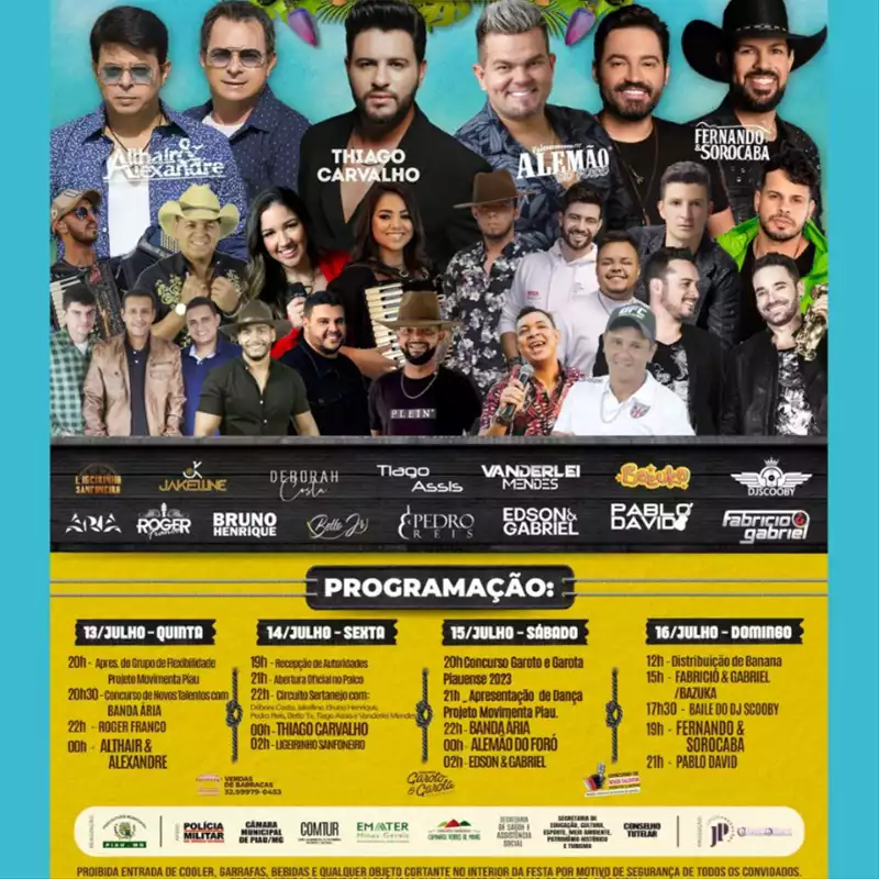 Do dia 13/07 (quinta-feira) até 16/07 (domingo) ocorre a 31ª edição da Festa da Banana de PiauMG.
