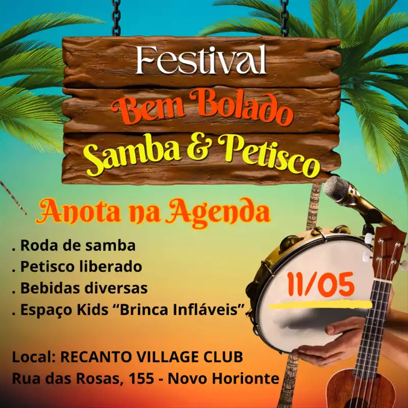 No dia 11/05 (sábado), a partir das 15h, ocorre o Festival Bem Bolado Samba & Petisco.