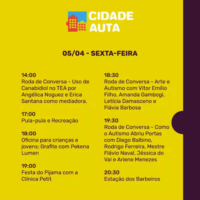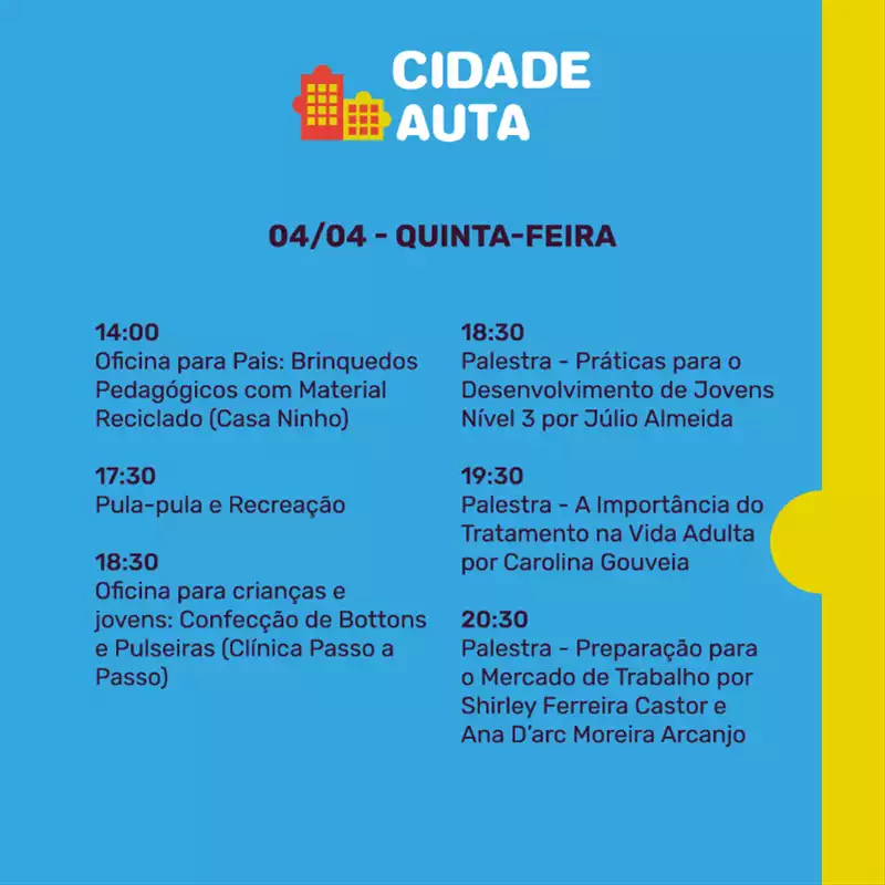 O Cidade Auta conta com palestras, oficinas, rodas de coversas e recreação. Confira a programação: