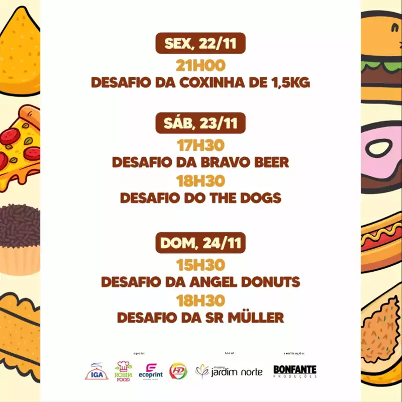 Nas quintas e sextas, o evento é das 17h às 23h e nos sábados e domingos de 12h às 23h e ocorre no estacionamento do Shopping Jardim Norte.