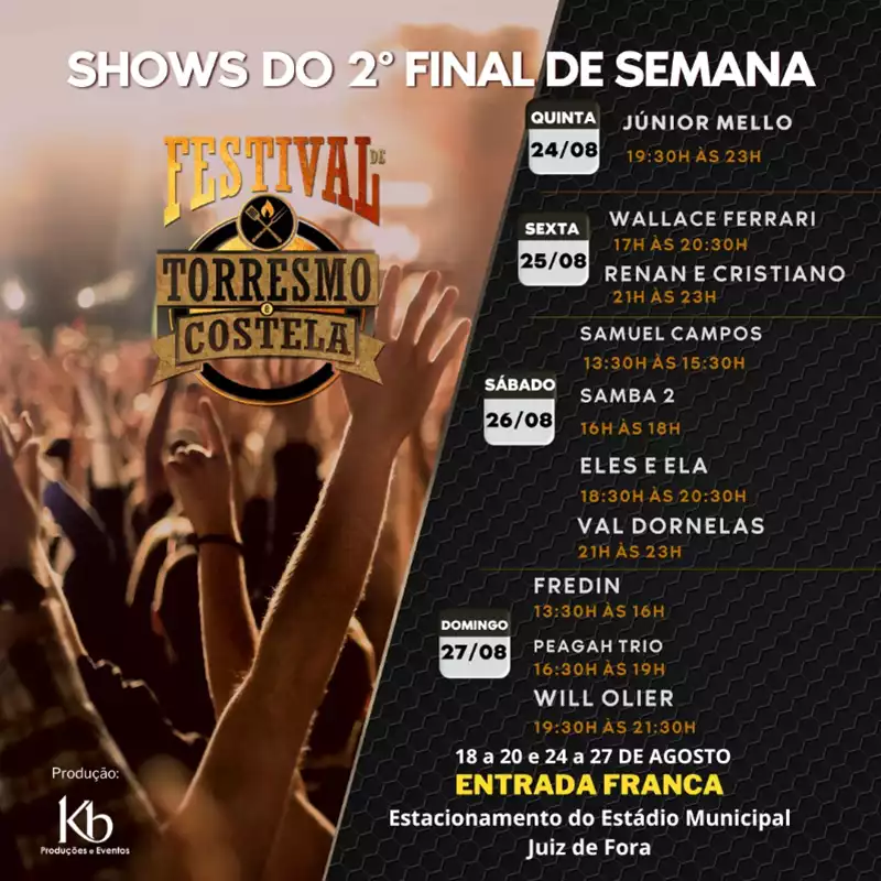 A 7ª edição do Festival de Torresmo e Costela (@festivaltorresmoecostela), “o original” de Juiz de Fora, ocorre do dia 22/08 (sexta-feira) até 24/08 (domingo), e de 29/08 (sexta-feira) até 31/08 (domingo).