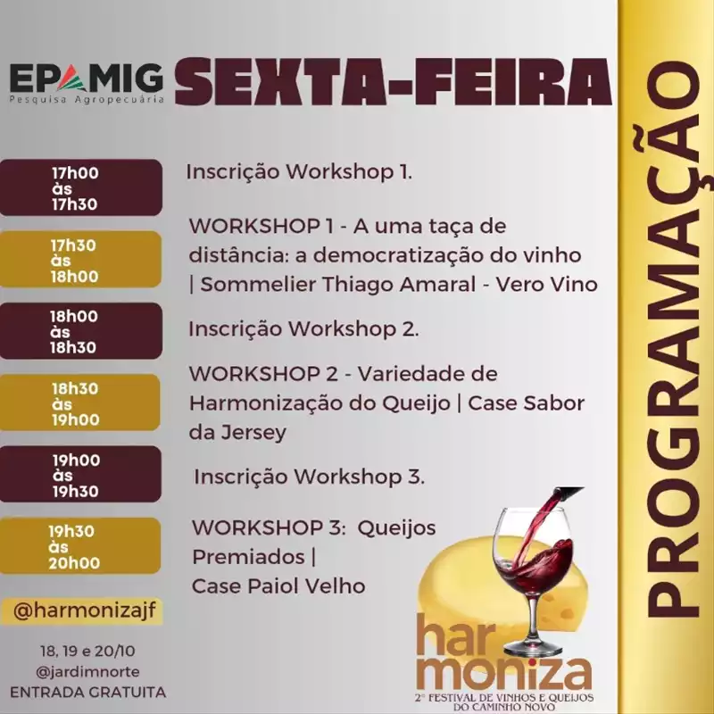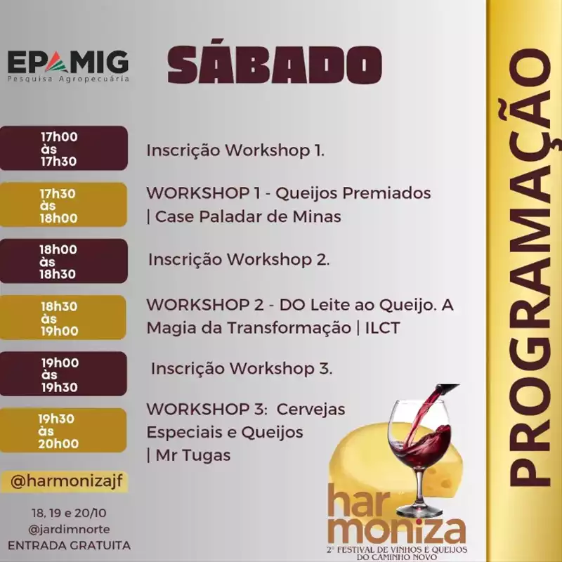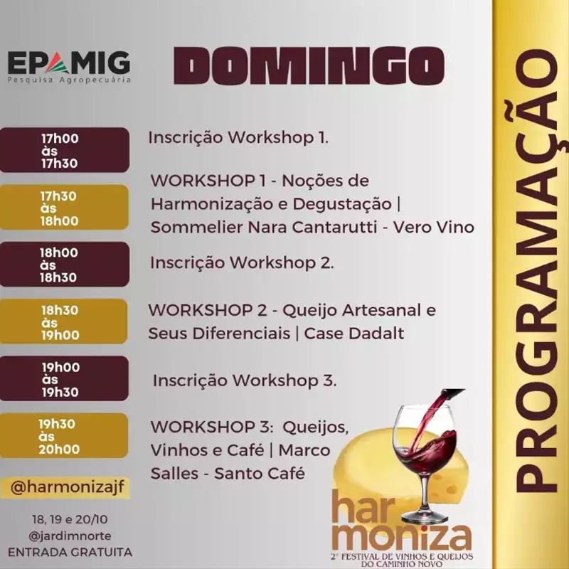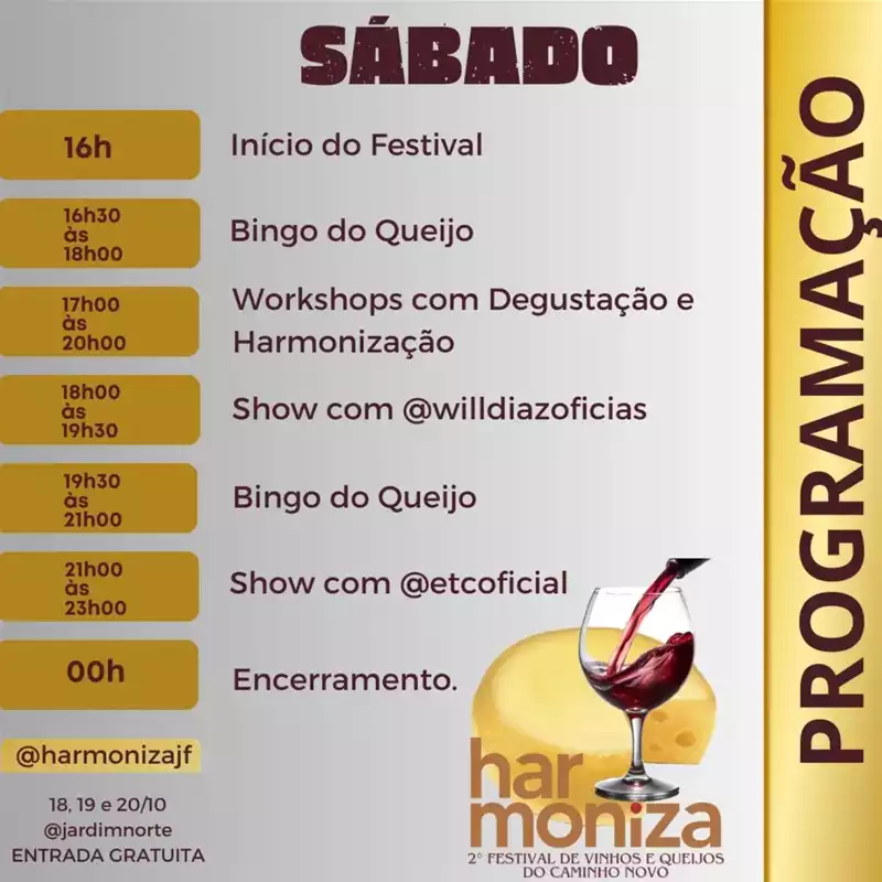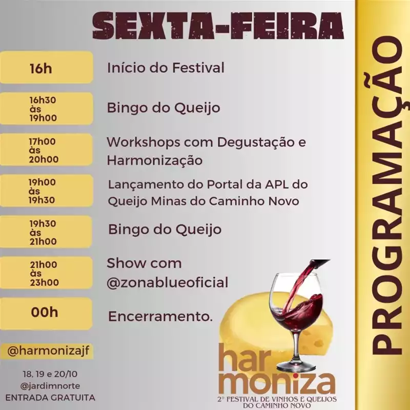 Do dia 08/08 (sexta-feira) até 10/08 (domingo) ocorre o Harmoniza – 3º Festival de Vinhos e Queijos do Caminho Novo, no estacionamento do Shopping Jardim Norte.