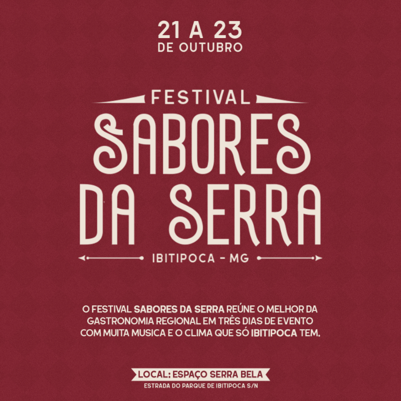 Nos dias 21, 22 e 23/10 (sexta, sábado e domingo) ocorre o Festival Sabores da Serra, no Espaço Serra Bela, em Ibitipoca.