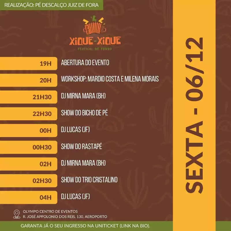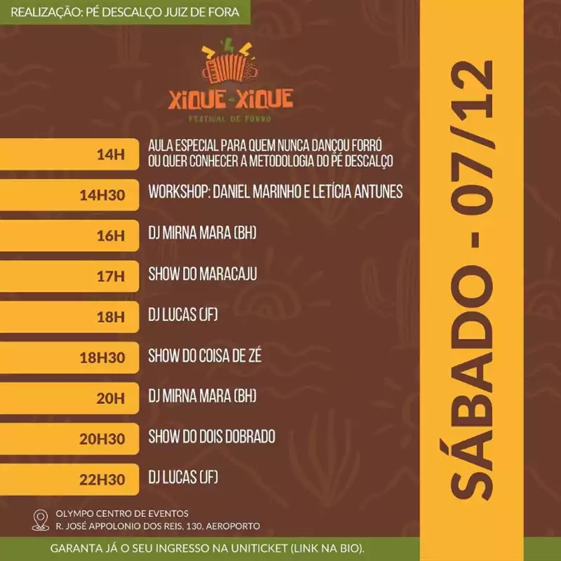 O evento ocorre no Olympo e reunirá grandes nomes do forró e terá workshop e aula de forró para iniciantes com o Pé Descalço (07/12 – 14h), levando conhecimento e novas técnicas para os participantes.