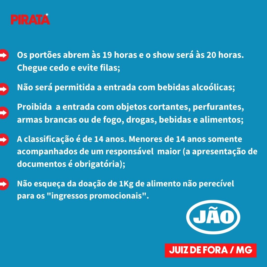 Conforme autorização judicial da Vara da Infância e Juventude de Juiz de Fora/MG, fica definida a classificação para a apresentação do artista “JÃO (Turnê Pirata)”, a ocorrer no dia 23 de outubro, no Terrazzo, da seguinte forma, como divulgado pela produção do evento (comunicado abaixo):