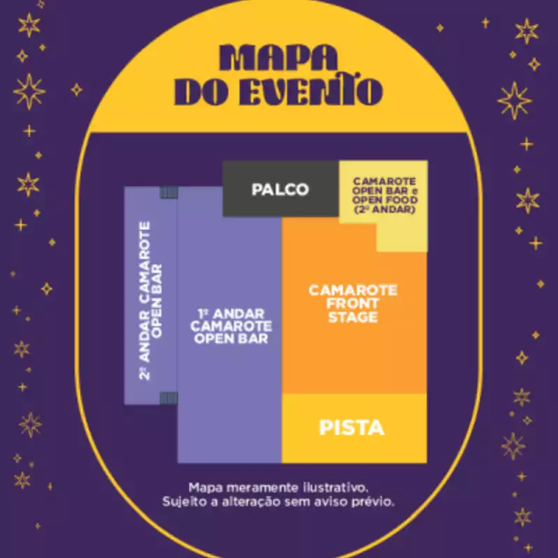 CAMAROTE OPEN BAR | Acesso à frente do palco, área lateral elevada, Bares, Área de alimentação e banheiros, Acesso à pista e ao Camarote Front Stage, open bar premium com Cerveja, Vodka, Refrigerante Schweppes, Coca-Cola e Guaraná Antártica, Gin, Tônica, Suco e Água.