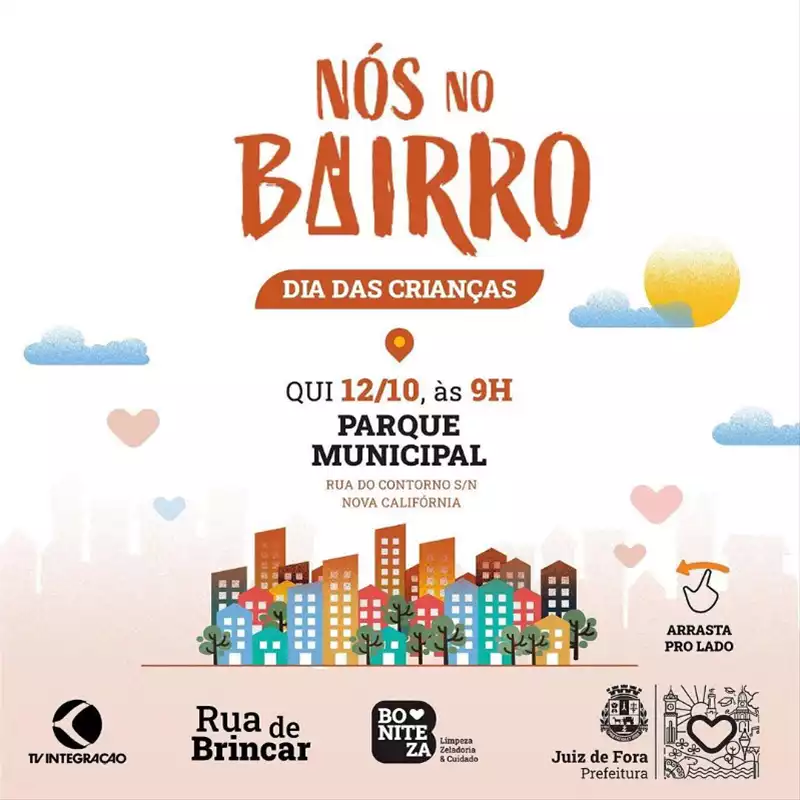 No dia 12/10 (quinta-feira), a partir das 9h, ocorre mais uma edição do "Nós no Bairro" em uma edição especial de Dia das Crianças no Parque Municipal.