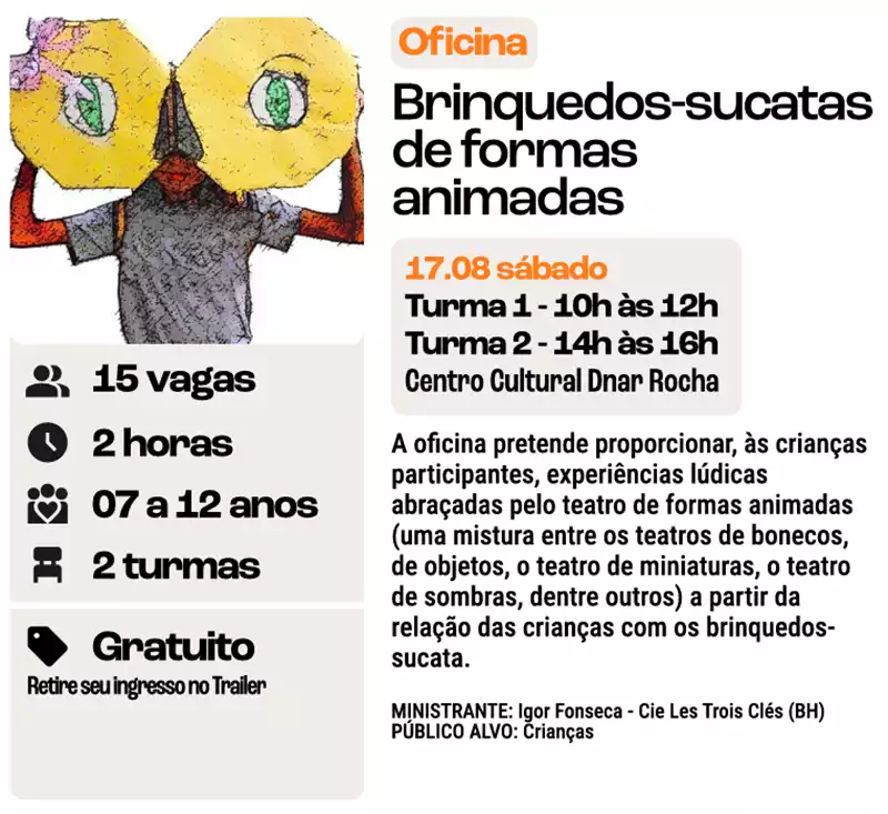 Sobre a oficina: A oficina pretende proporcionar, às crianças participantes, experiências lúdicas abraçadas pelo teatro de formas animadas (uma mistura entre os teatros de bonecos, de objetos, o teatro de miniaturas, o teatro de sombras, dentre outros) a partir da relação das crianças com os brinquedos sucata.