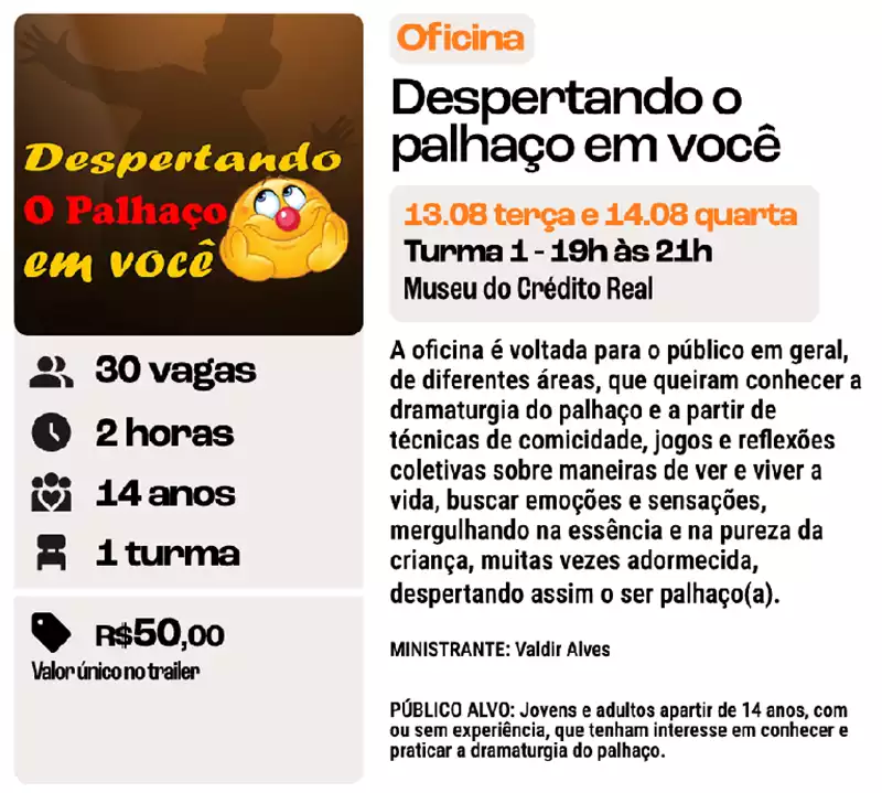 Sobre a oficina: A oficina é voltada para o público em geral, de diferentes áreas, que queiram conhecer a dramaturgia do palhaço e a partir de técnicas de comicidade, jogos e reflexões coletivas sobre maneiras de ver e viver a vida, buscar emoções e sensações, mergulhando na essência e na pureza da criança, muitas vezes adormecida, despertando assim o ser palhaço(a).