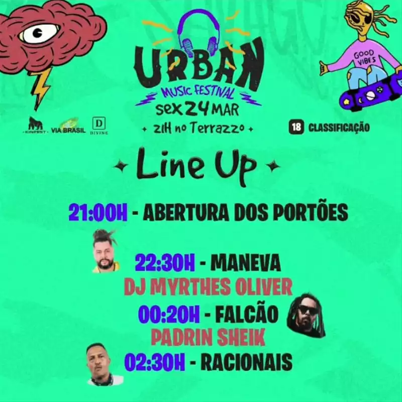 Urban Music Festival com Racionais MC's, Marcelo Falcão e Banda Maneva se apresentam no dia 24/03/2023 (sexta-feira), no Terrazzo!