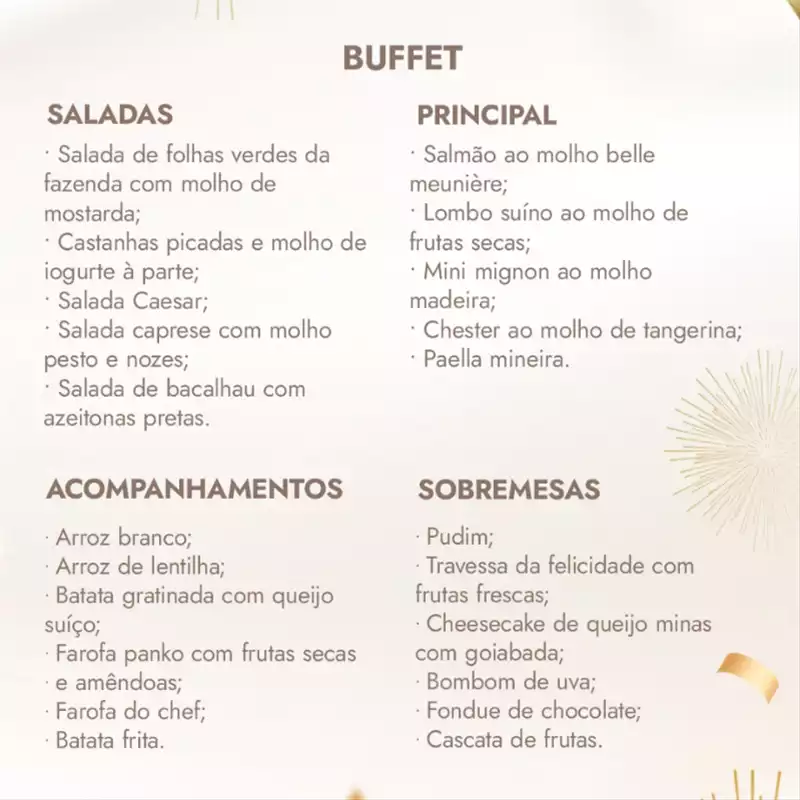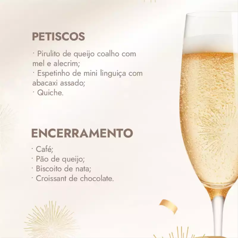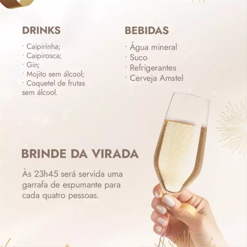Às 23h45 será servida uma garrafa de espumante para cada quatro pessoas.