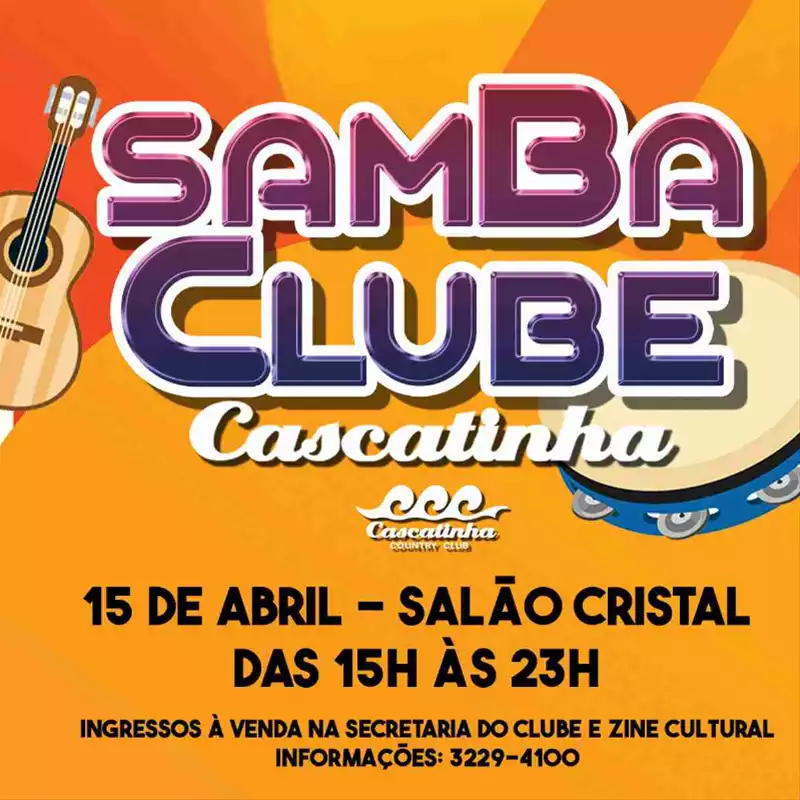 No dia 15/04 (sábado), a partir das 15h, ocorre o Samba Clube do Clube Cascatinha, no Salão Cristal.