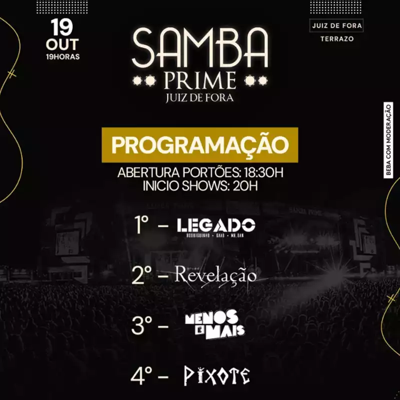 #VocêSabePrimeiroNoZINE: A 3ª edição do Samba Prime em Juiz de Fora, maior festival de Samba e Pagode, ocorre no dia 19/10 (sábado), a partir das 18h30, no Terrazzo.