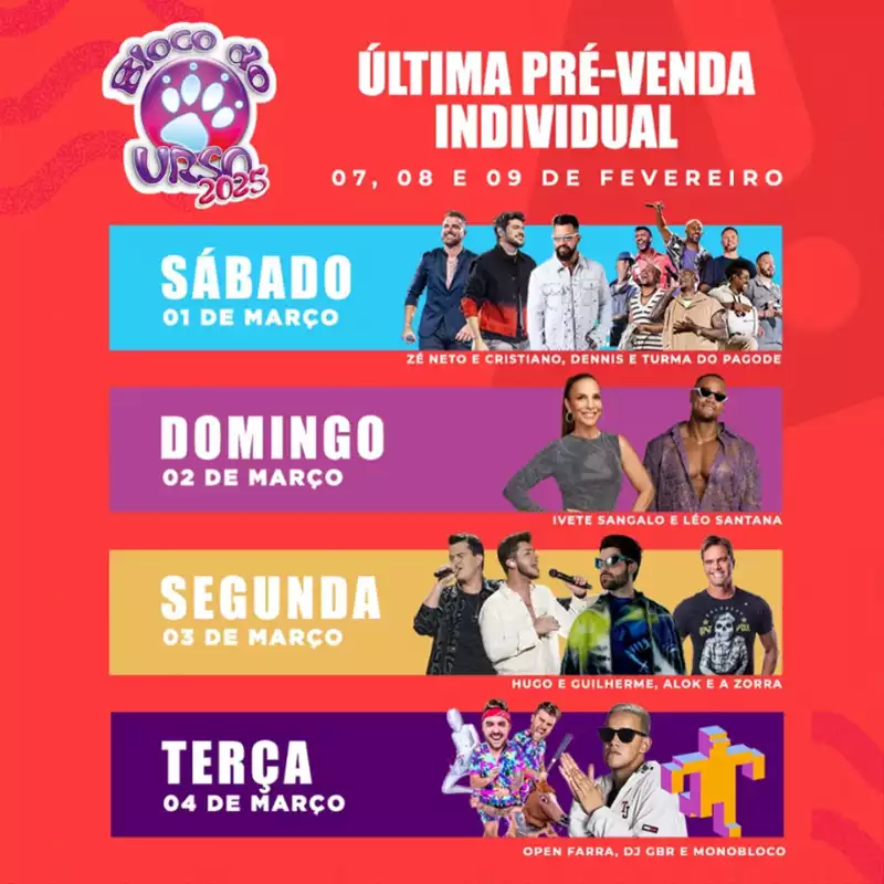 Em 2024, entre os dias 01 e 04 de fevereiro (sábado a terça-feira), o tradicional Bloco do Urso em Santa Rita do Sapucaí/MG reúne diversos nomes do cenário musical nacional.