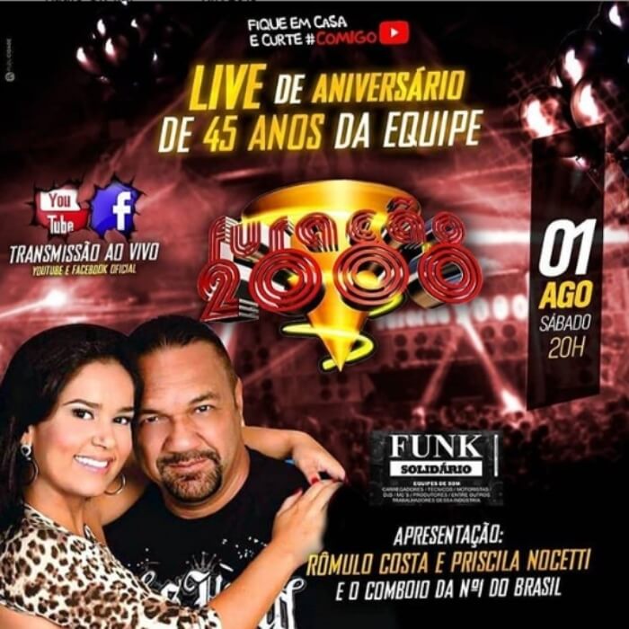 No dia 01/08 (sábado), a partir das 20h, ocorre a nova live da Furacão 2000 com transmissão no Youtube e na rádio online Furacão. Com o comando de Rômulo Costa e Priscila Nocetti, a transmissão ao vivo irá recordar os hits que marcaram o funk no Brasil e últimos lançamentos.