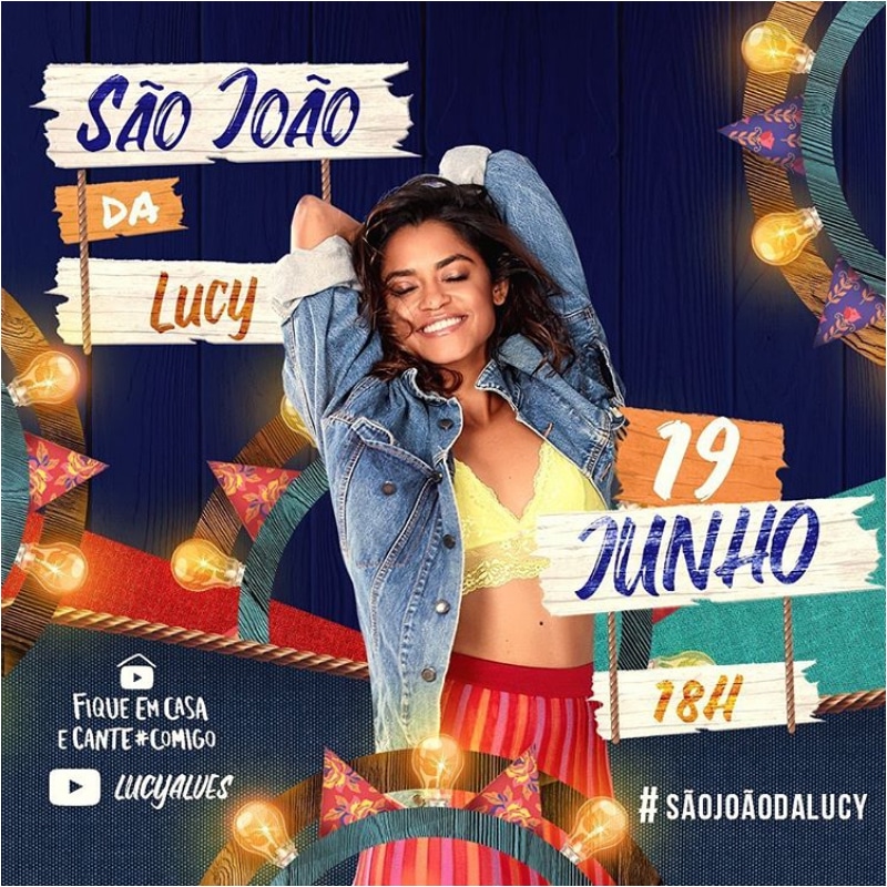 Como parte do projeto “Fique Em Casa e Cante #Comigo”, no dia 19/06 (sexta-feira), a partir das 18h, ocorre a live da Lucy Alves. A cantora prepara uma apresentação com tema de São João.