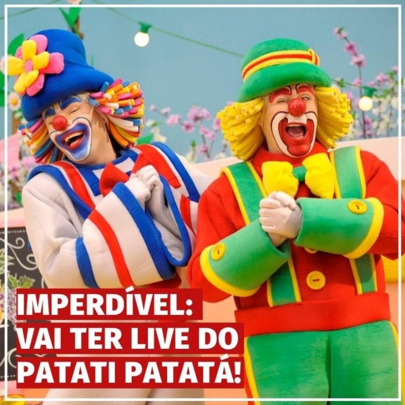 No dia 30/05 (sábado), a partir das 17h, ocorre a live do Patati e Patatá – Seus Melhores Amigos. A apresentação contará com músicas, histórias e convidados especiais, como o Lorô da música “Canção do Lorô”, o macaco e o vovô.