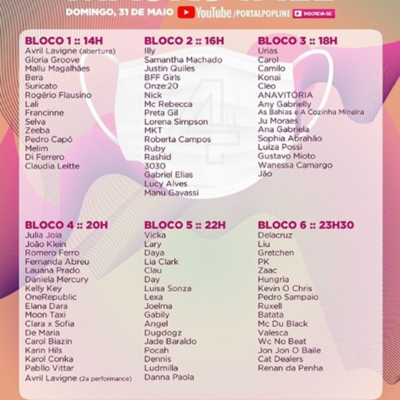 No dia 31/05 (domingo) a partir das 14h, ocorre a live do POPlineMasks4ALL. Artistas do Brasil e do mundo participam do festival, criado pelo POPLine. O evento será transmitido por meio do canal oficial do portal no Youtube. Confira a programação: