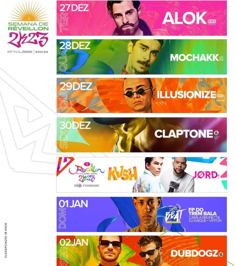 A Semana de Réveillon Privilège Búzios/RJ, um dos maiores Réveillons do Brasil, ocorre de terça-feira (27/12) até segunda-feira (02/01/23), sempre a partir das 23h59.