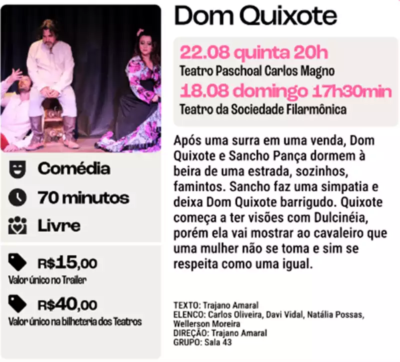 O espetáculo "Dom Quixote", apresentado pelo grupo Sala 43, será realizado em dois dias:
