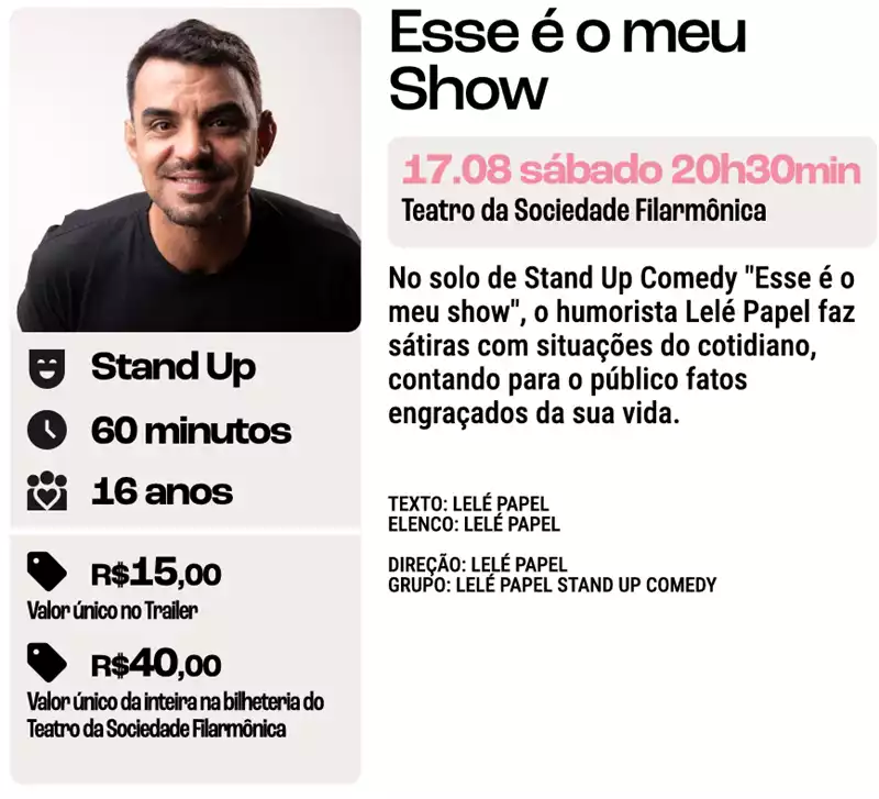 Sinopse: O espetáculo é um solo de stand up comedy com o humorista Lelê Papel, que apresenta sátiras de situações do cotidiano, contando ao público histórias engraçadas da sua vida. Com mais de 10 anos de carreira, Lelê aborda temas como relacionamentos amorosos, experiências familiares e situações inusitadas com amigos.