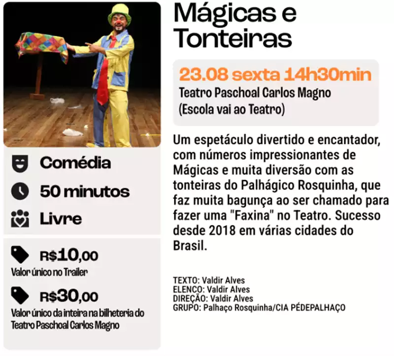 No dia 23/08 (sexta-feira), o Teatro Paschoal Carlos Magno recebe a Peça "Mágicas e Tonteiras".