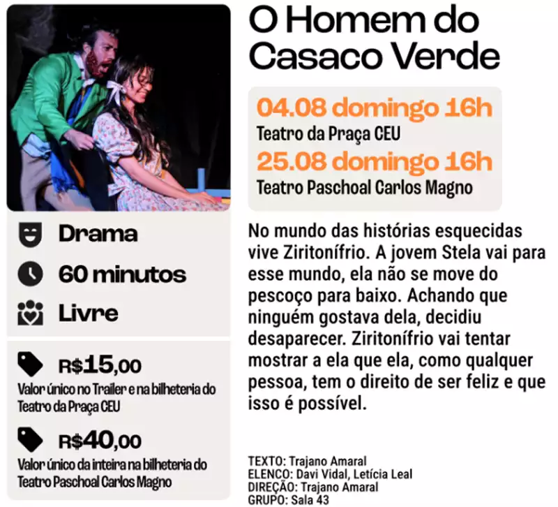 - No dia 04/08 (domingo), às 16h, no Teatro da Praça CEU.