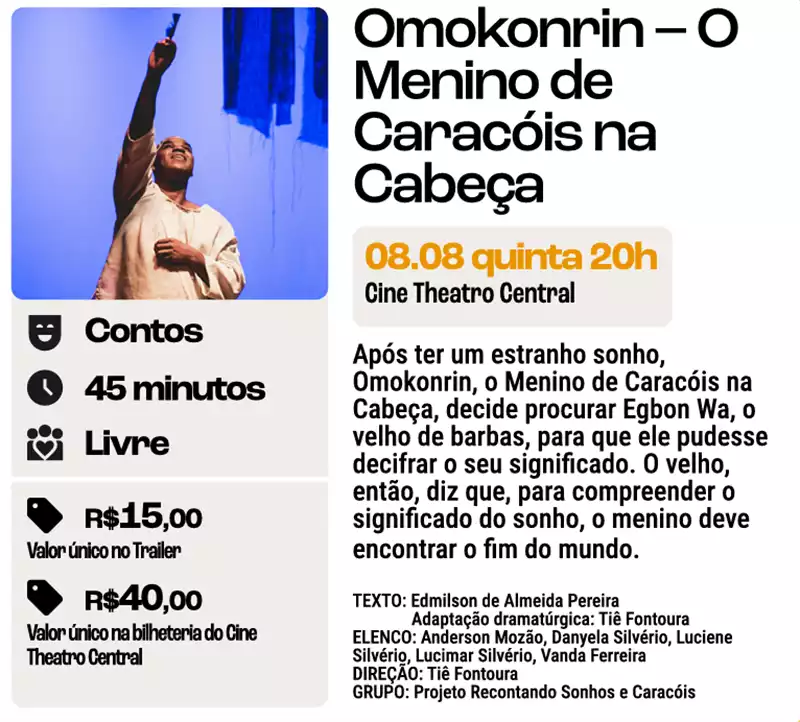 No dia 08/08 (quinta-feira), o Cine-Theatro Central recebe o Conto "Omokonrin – O Menino de Caracóis na Cabeça".
