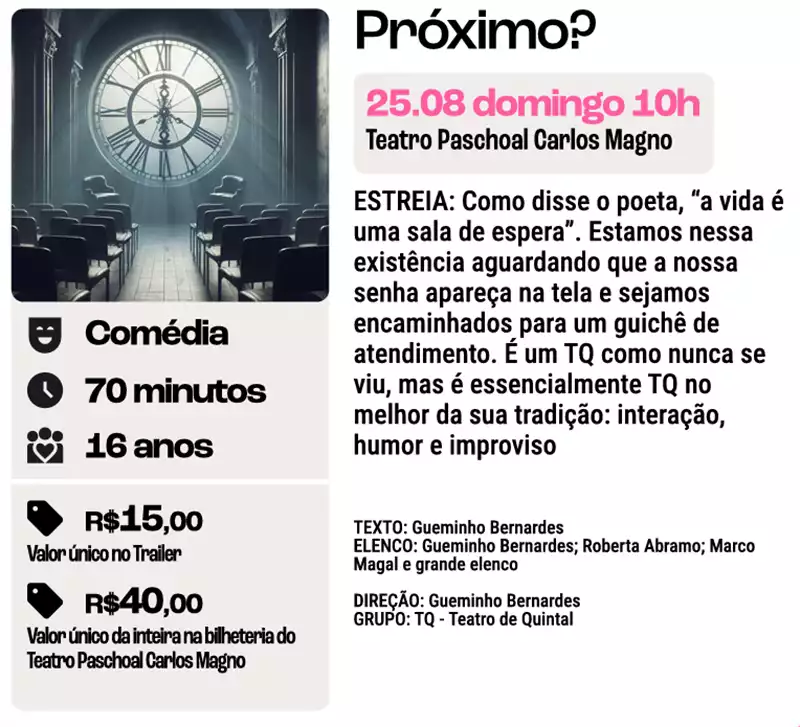 Sinopse da peça: Como disse o poeta, “a vida é uma sala de espera”. Estamos nessa existência aguardando que a nossa senha apareça na tela e sejamos encaminhados para um guichê de atendimento. É um TQ como nunca se viu, mas é essencialmente TQ no melhor da sua tradição: interação, humor e improviso.