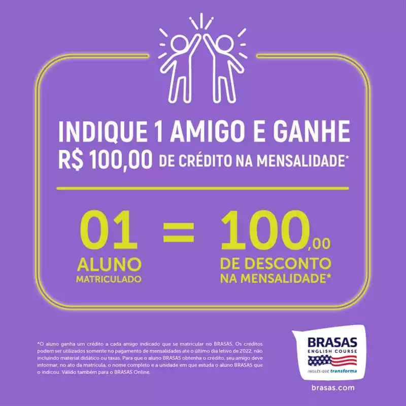 O curso possui a campanha indique um amigo, na qual, você ganha R$ 100 de desconto na mensalidade por cada amigo que você indicar e se matricular no curso. Já chama todos os amigos para aprender o idioma junto!