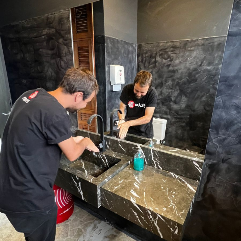 Além de dar uma nova cara para toda a parte interna e externa da sede, incluindo portas e janelas, as tintas ainda nos ajudaram a criar texturas como cimento queimado, dando aquele toque ainda mais especial nas paredes.