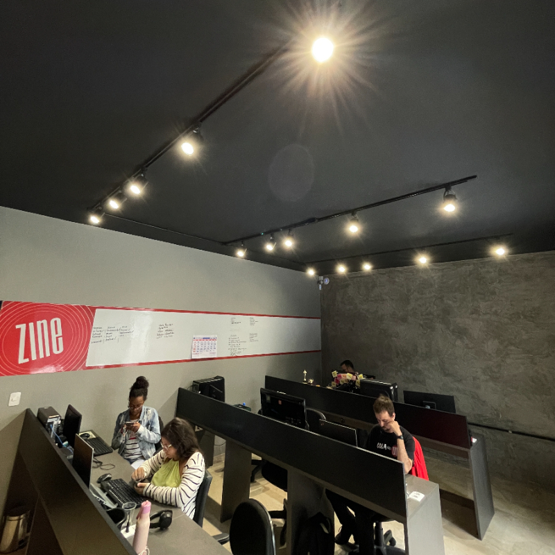 Na entrada, uma luminária super criativa que combina com o jeito #Zine de ser, e na redação, trilhos de iluminação por toda a sala: a luz perfeita para trabalhar e para produzir nossos vídeos!