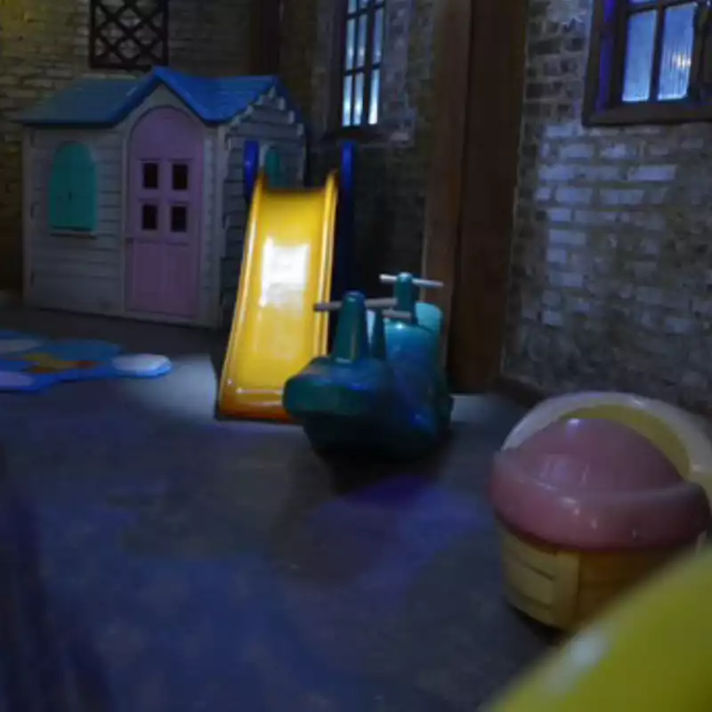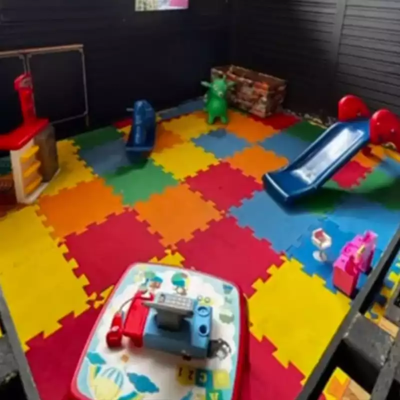 🎨 O que tem no espaço kids: mini escorregador, mini cavalinho, brinquedos variados
