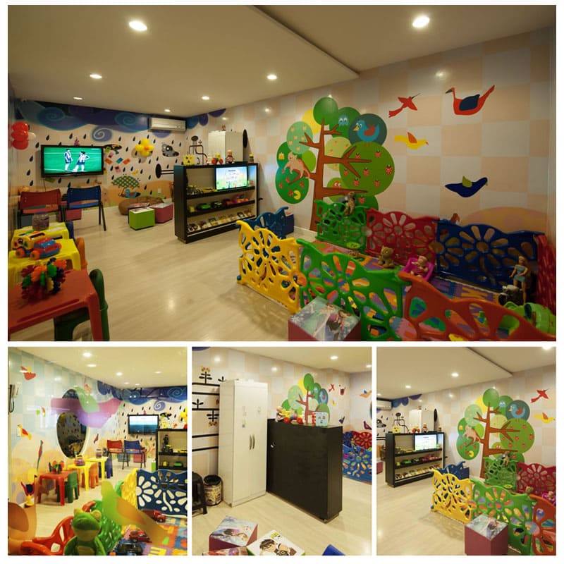 🎨 O que tem no espaço kids: Espaço com televisão, videogames, além de brinquedos diversos, para várias idades, em um amplo espaço com cadeiras e mesas infantis.