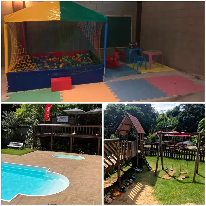 🎨 O que tem no espaço kids: Parquinho de areia na área externa com escorrega, balanço e gangorra, piscina de bolinhas, mini espaço kids com atividades, piscina adulto e infantil.