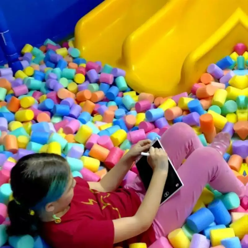 🎨 O que tem no espaço kids: Escorregador, piscina de bolinhas, e mais