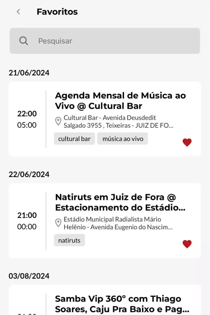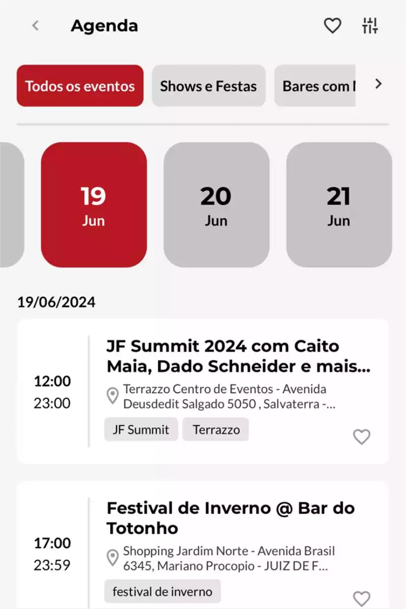 No nosso app vão ter todos os eventos, e você ainda vai poder favoritar aqueles que forem mais a sua vibe, e receber comunicação personalizada com indicações de eventos e outros conteúdos, como sorteios.