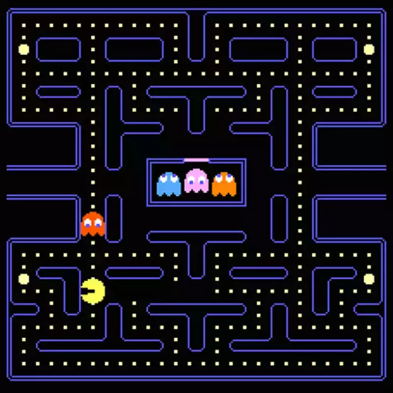 O jogo consiste em percorrer um labirinto percorrendo "pontos" enquanto foge de 4 fantasmas.