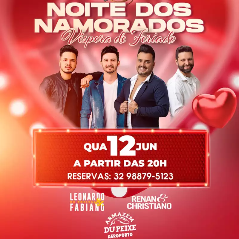 🎤 Música: A noite dos namorados será de sertanejo com Leonardo de Freitas & Fabiano e Renan & Christiano.