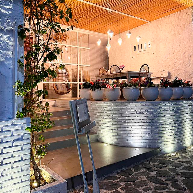 Possui uma culinária mediterrânea e contemporânea e uma arquitetura que te faz se sentir na própria ilha grega.