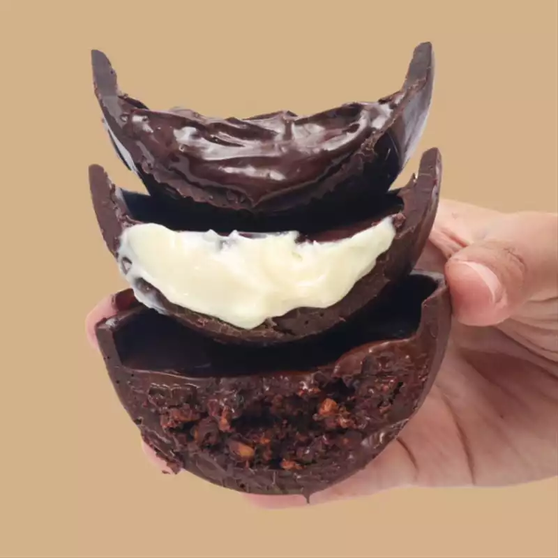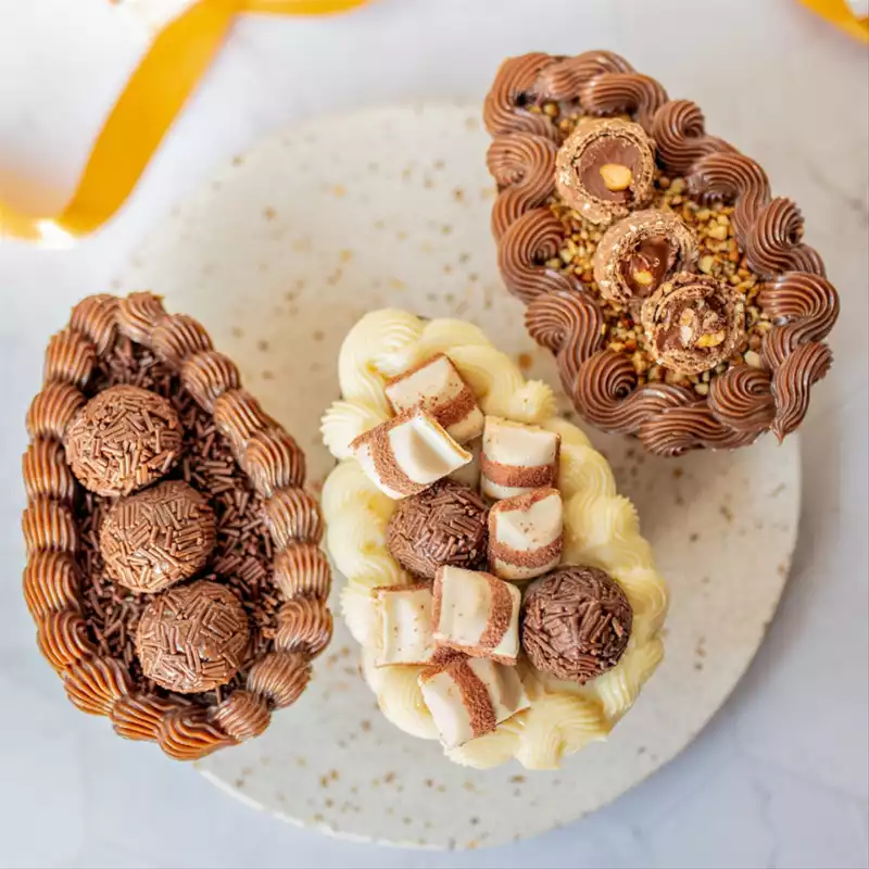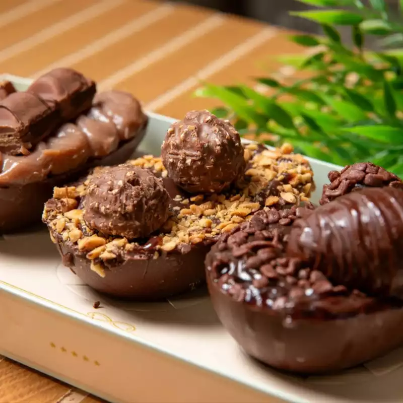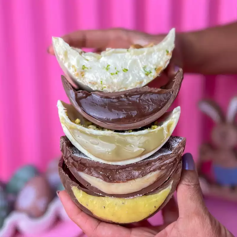 Por lá você encontra kit com 4 ovos, barras recheadas, ovo brownie, ovo trufado e, claro, ovos para comer de colher com sabores como Ferrero Rocher e mix Kinder Bueno.