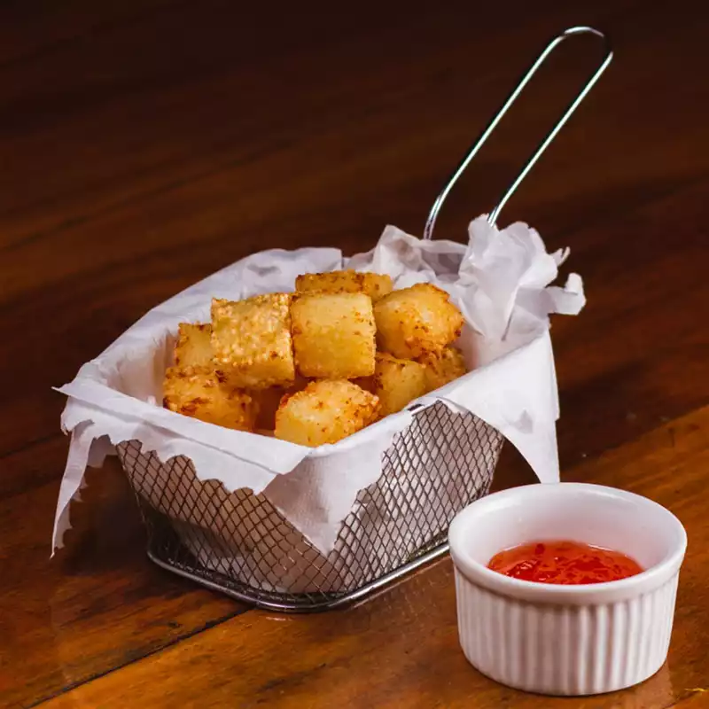 Uma das opções, o Zé Pequeno, são dadinhos de tapioca fritos feitos com queijo meia cura da Serra da Canastra!