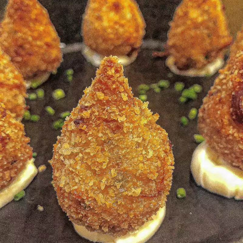 A coxinha é um petisco tradicional do Brasil, e o Bar du Buneco tem uma coxinha especial recheada de bacon, cebola caramelizada e catupiry!