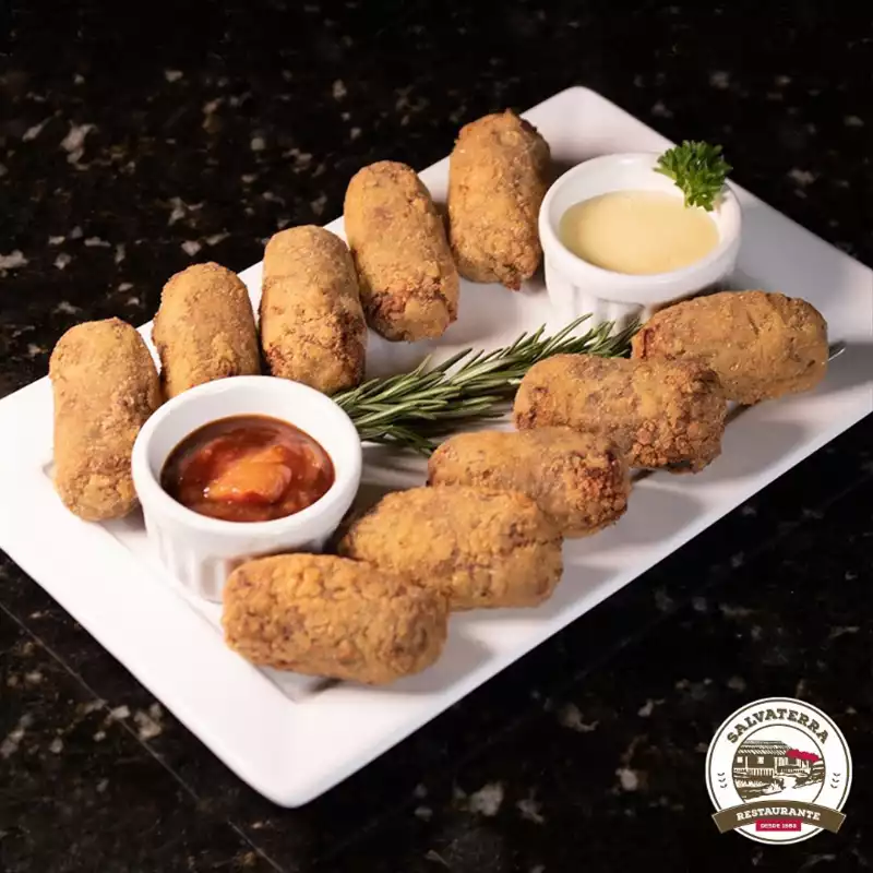 Lá tem o croquete real feito com alcatra e acompanhado de molhos de queijo e goiabada.